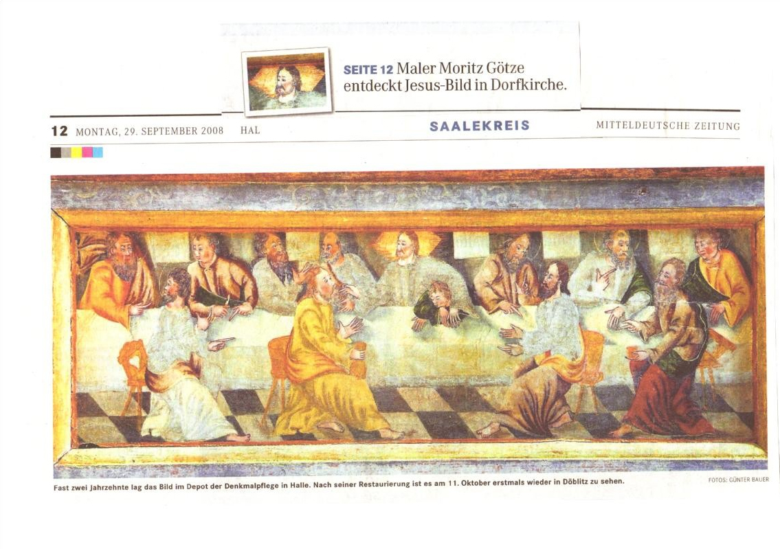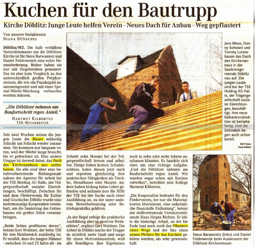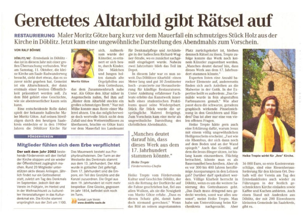 Die Orgelweihe am 21. Mai wird in besonderer Weise begangen. Bereits ab 15 Uhr gibt es Kaffee und Kuchen. Der dann womöglich frisch gebackene Orgelbaumeister Josef Poldrack bietet Orgelführungen an und beantwortet Fragen der Besucher. 17 Uhr folgt ein Weih-Gottesdienst mit Pfarrer Andreas Schuster. Organist Tim-Dietrich Meyer gibt das erste Konzert auf der restaurierten Orgel. (Beitrag aus der Mitteldeutschen Zeitung, mz)