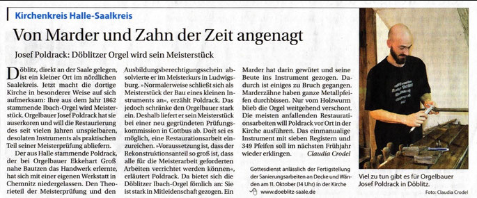Dieser Tage baut Josef Poldrack das Instrument wieder zusammen, das über sieben Register verfügt. Einige Register klingen bereits wieder. Mit Lukas Georgi aus Markersbach im Erzgebirge hilft ihm ein Freund und Kollege beim Einbau. Georgi hat bereits seine Meisterprüfung vollständig abgelegt. Für Poldrack kommt der große Moment am 19. Mai. Dann trifft eine Prüfungskommission in Döblitz ein, dem in einer Sackgasse direkt an der Saale gelegenen kleinen Dorf, das zur Stadt Wettin-Löbejün gehört. Die Experten begutachten, was Poldrack geschaffen hat und ob er des Meistertitels würdig ist. Der junge Orgelbauer ist optimistisch.
