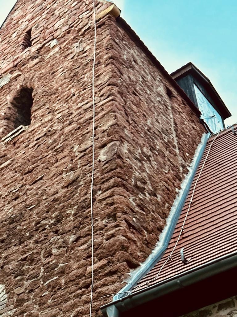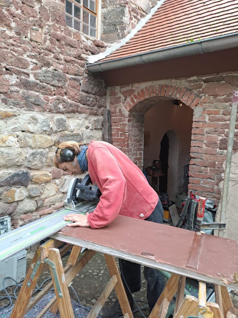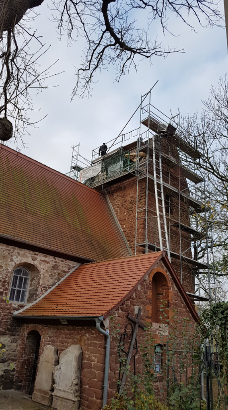- Reparatur des nördlichen Turmgiebels durch (Steinmetz Mike Gebhard, Wettin)
