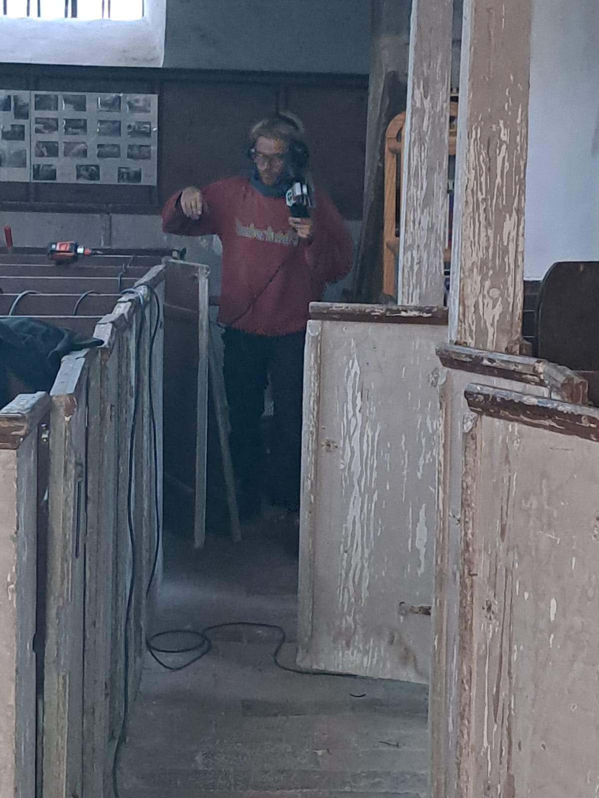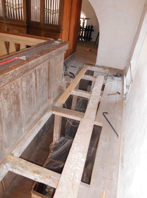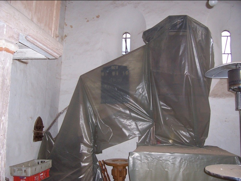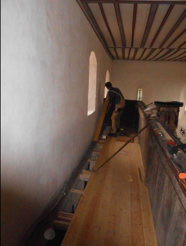 Ohne Dach ist der Kircheninnenraum der Witterung ausgesetzt. Um ihn zu schützen, werden Kanzel und Orgel wetterfest gemacht.