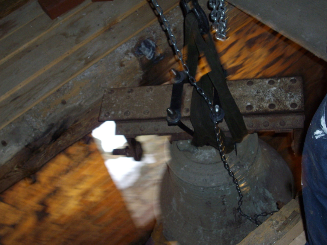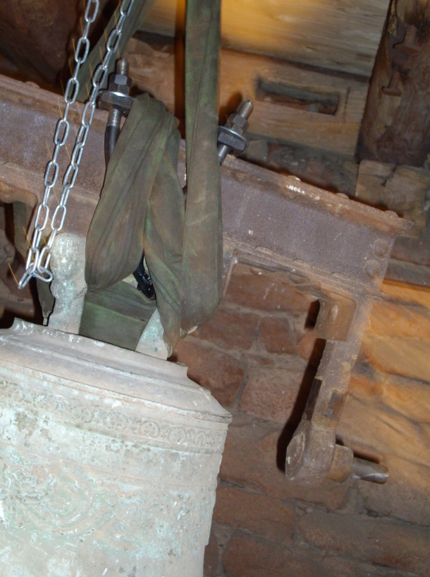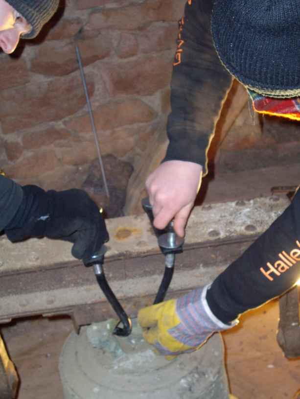 Am 23.01.2010 wird die Glocke neu eingehängt. Dafür wird sie zunächst an einem Stahlträger befestigt. Um den Stahlträger werden Ketten gelegt, an denen Stahlträger und Glocke nach oben gezogen werden. Der Stahlträger wird so gedreht, dass er in der Haltevorrichtung einrastet. Die Glocke ist aufgehängt.